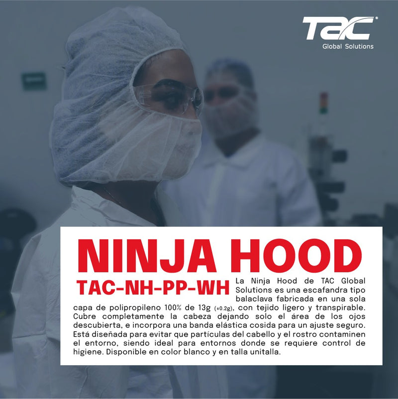 La Escafandra Ninja Hood de Polipropileno TAC ofrece una cobertura integral de cabeza y cuello, ideal para entornos que requieren máximos niveles de higiene. Fabricada con polipropileno de alta calidad, garantiza transpirabilidad y resistencia, evitando la contaminación por partículas o cabello en líneas de producción.