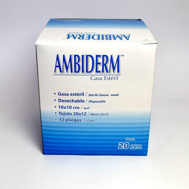 Gasa de algodón Ambiderm estéril, ideal para curaciones y procedimientos quirúrgicos. Tamaño 10x10 cm en práctica caja de 20 sobres con 5 piezas. Tejido suave, altamente absorbente y seguro.