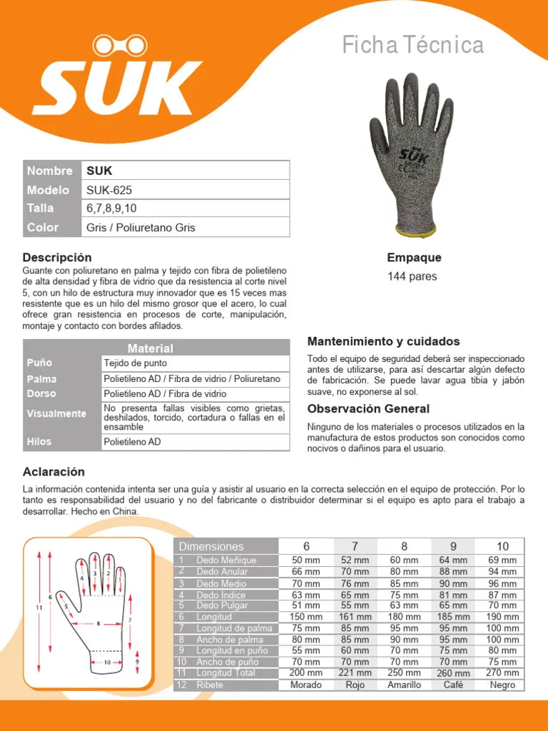 El Guante de Polietileno con Fibra de Vidrio Modelo SUK-625 está diseñado para ofrecer alta protección contra cortes, manteniendo comodidad y precisión en el manejo de piezas. La combinación de polietileno de alta resistencia con fibra de vidrio brinda una excelente durabilidad y desempeño en trabajos exigentes.